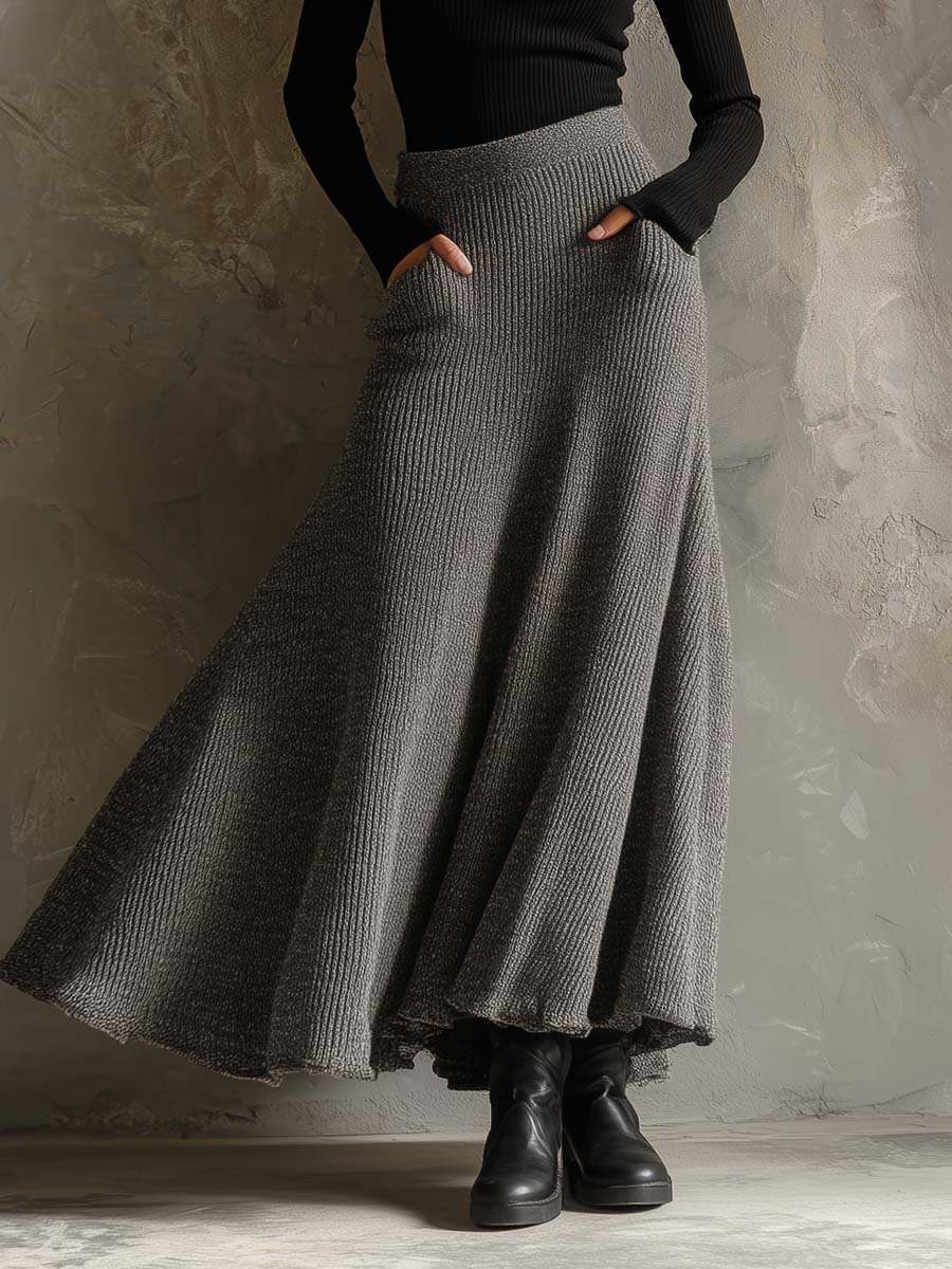 Gray Ribbed Knit Maxi Skirt With Pockets