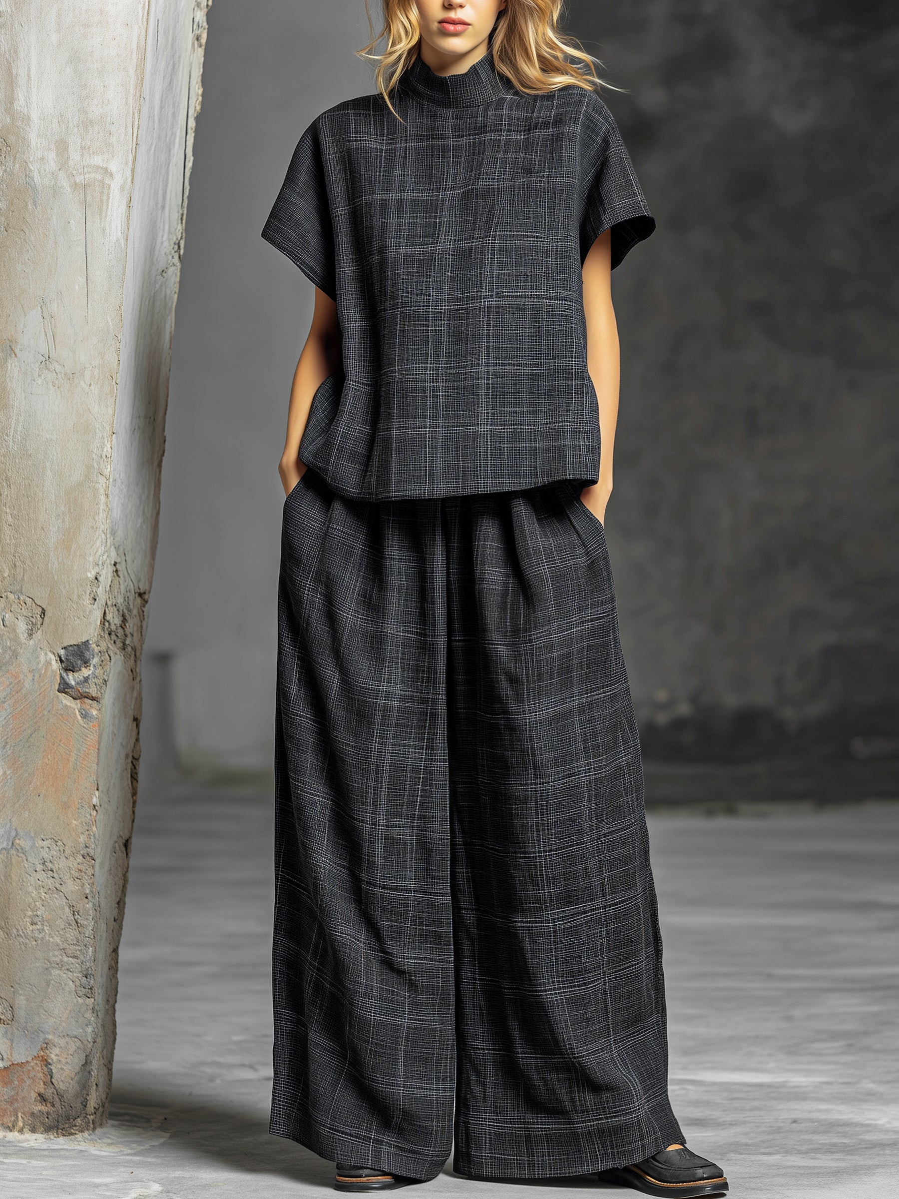 High-Neck Boxy Top & Wide-Leg Plaid Pants Set