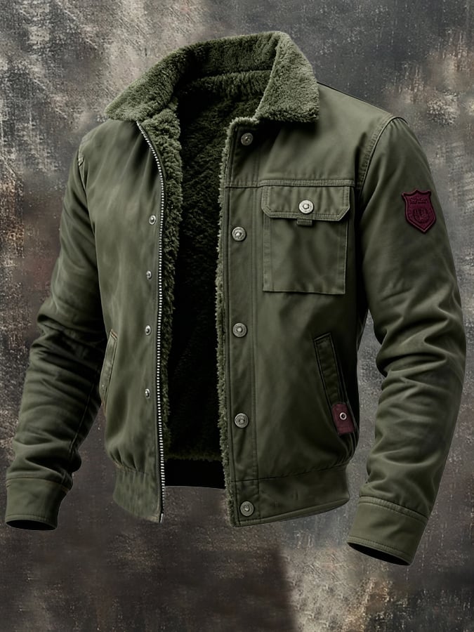 (Inner Pocket Design) Men's Retro Pure Cotton Twill Fleece-Lined Warm Multi-pocket Outdoor Jacket