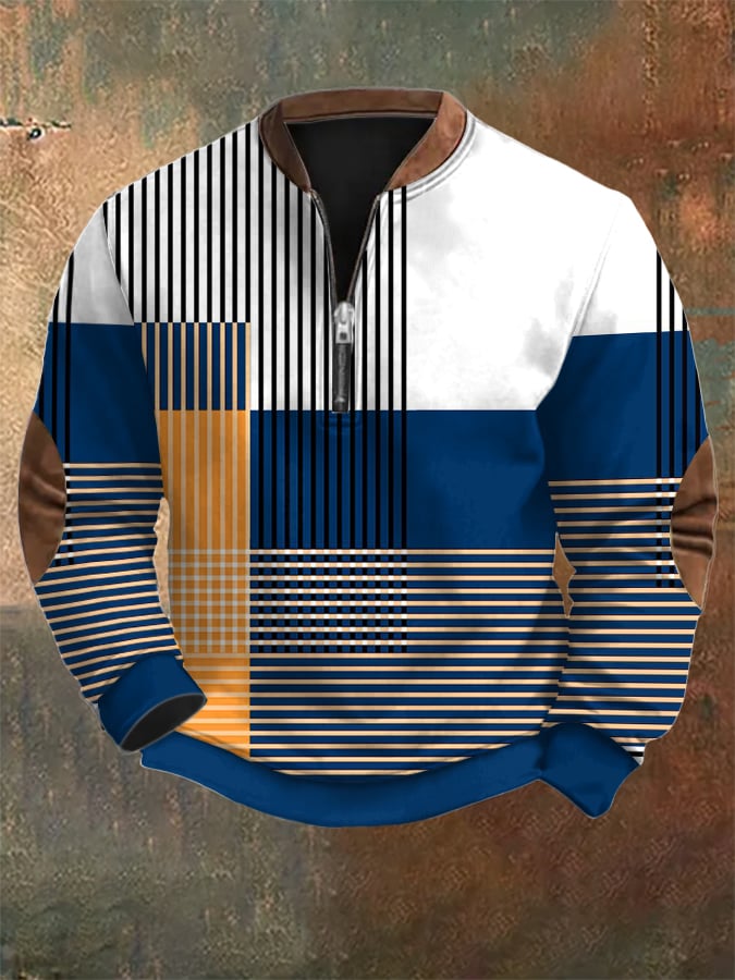 Men's Retro Mondrian Color Block Print Zip Collar Sweatshirt