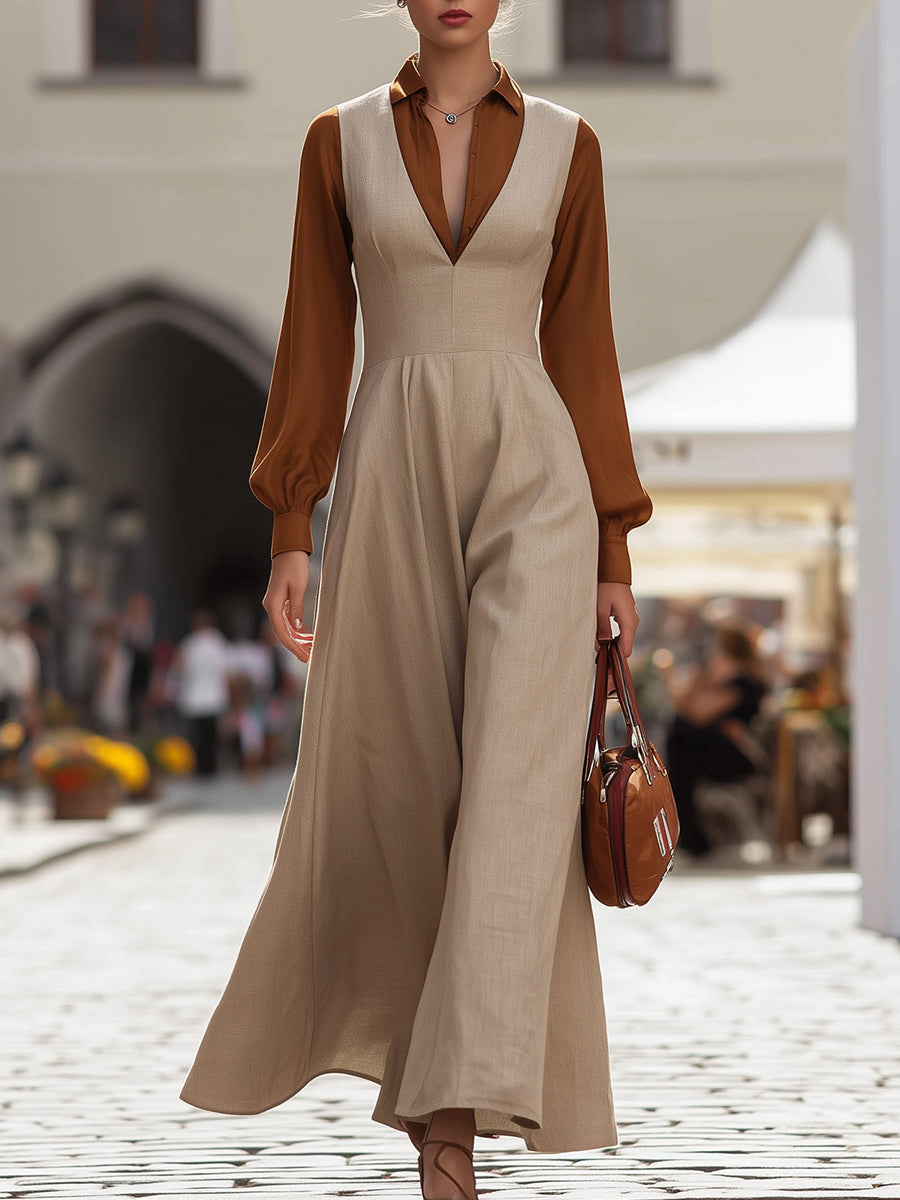 Below the waist, the skirt gently flares into a fluid midi length, allowing for natural movement with every step. The contrast between the structured top and flowing lower half creates visual balance, offering both authority and femininity in equal measure. The fabric’s soft drape ensures comfort throughout the day while maintaining a crisp, tailored appearance. This dress transitions seamlessly from daytime meetings to evening engagements. Styled with classic pumps and minimal jewelry, it delivers a professional, confident look; paired with statement accessories and heels, it becomes an elegant choice for dinners or events.