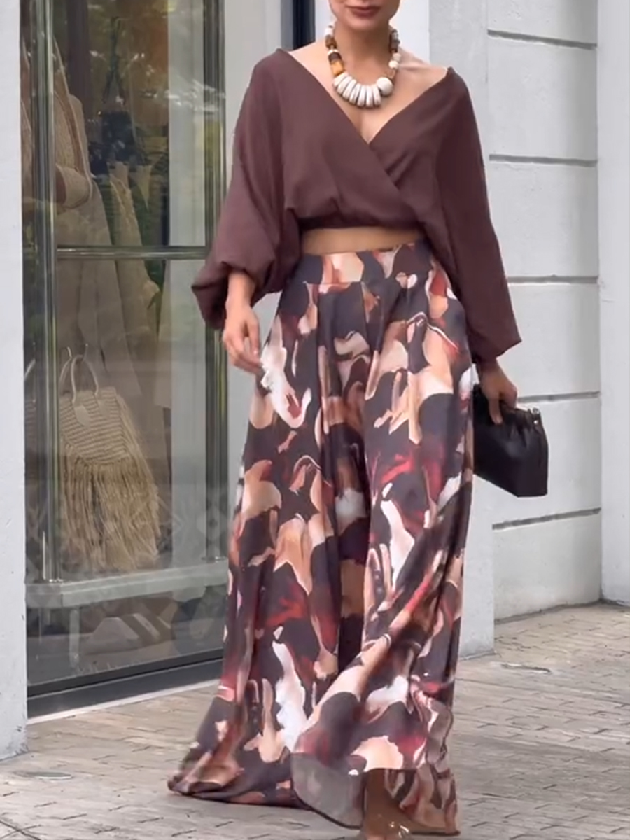 Two-piece Set: Casual Cropped Top And Art-print Wide-leg Pants