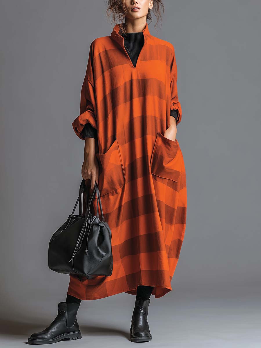 The Vintage Fashion Ultra Loose V-neck Maxi Dress is a stunning blend of orange and brown wide stripes, designed with an ultra-relaxed fit. It features a deep V-neckline and large pockets, which add functionality and a casual elegance to its classic vintage style. The maxi length of the dress creates a elongating silhouette, while the play of stripes adds depth and interest to the overall look.