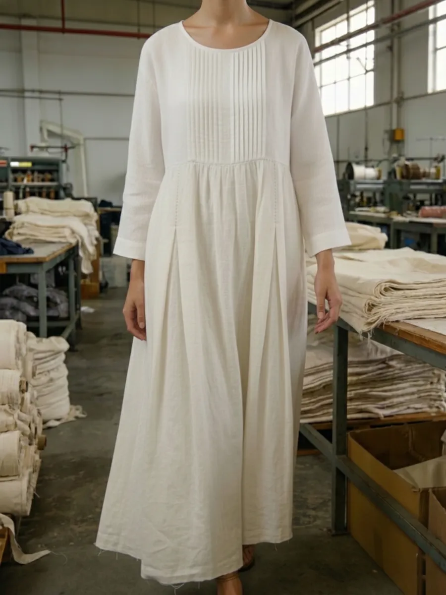 Vintage-style Pleated Linen Midi Dress