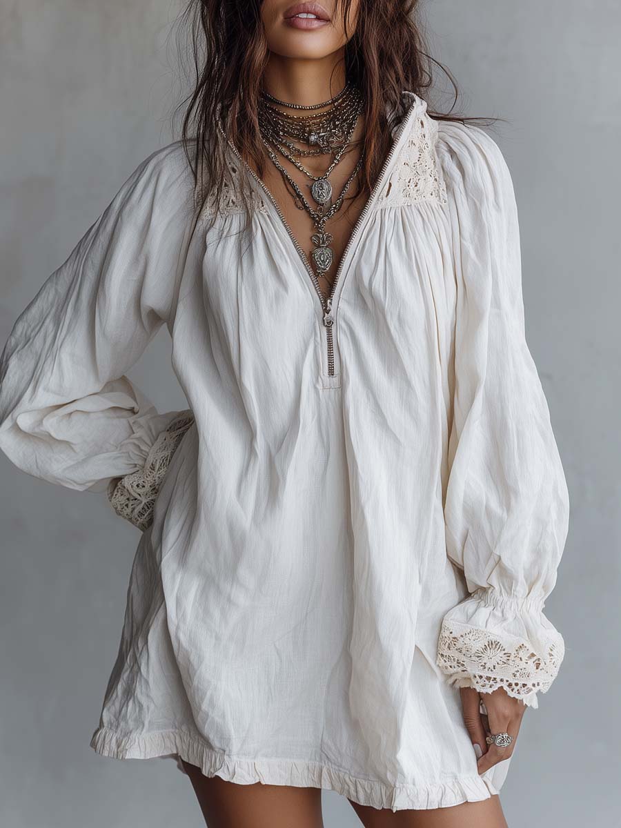 Vintage-style Zip-up Collar Lace-trimmed White Mini Dress