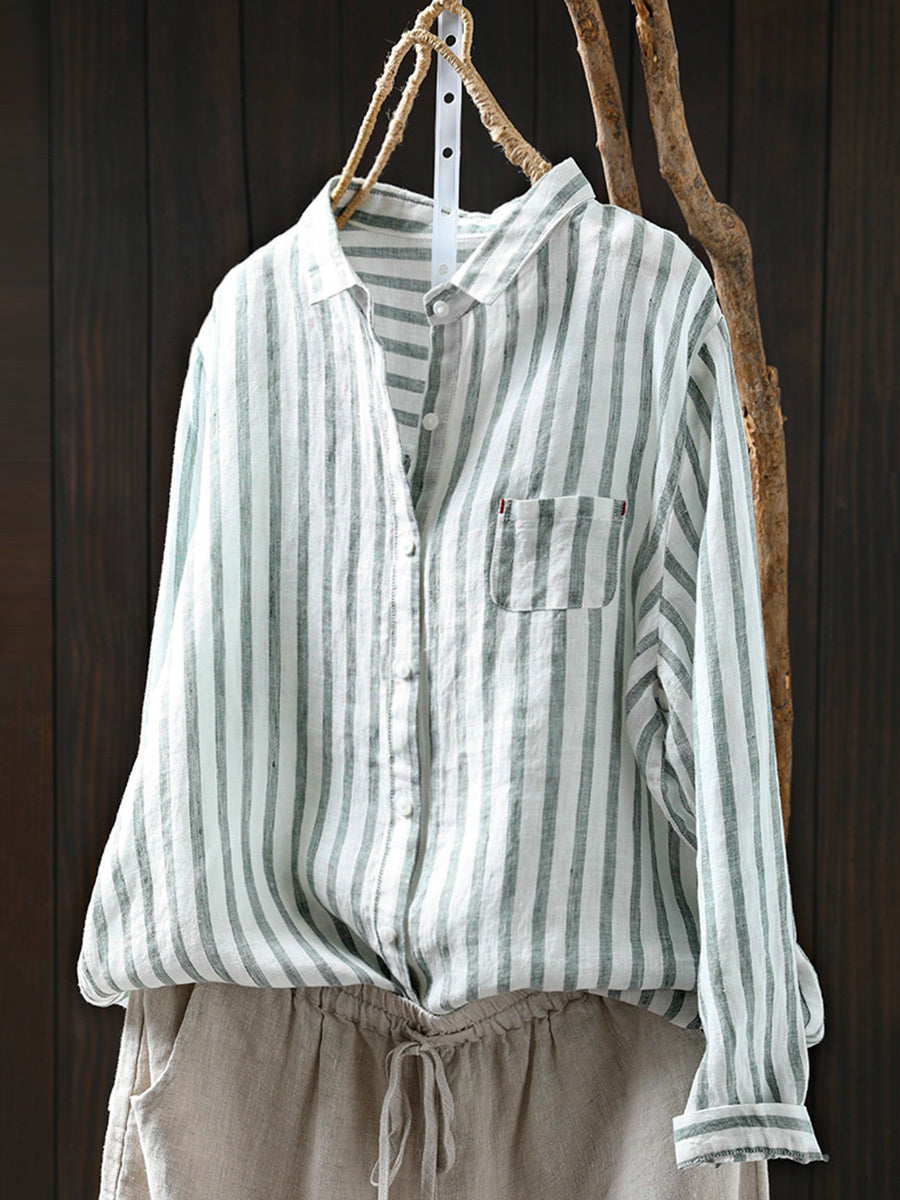 Women Summer Stripe Turn-down Collar 100%Linen Shirt