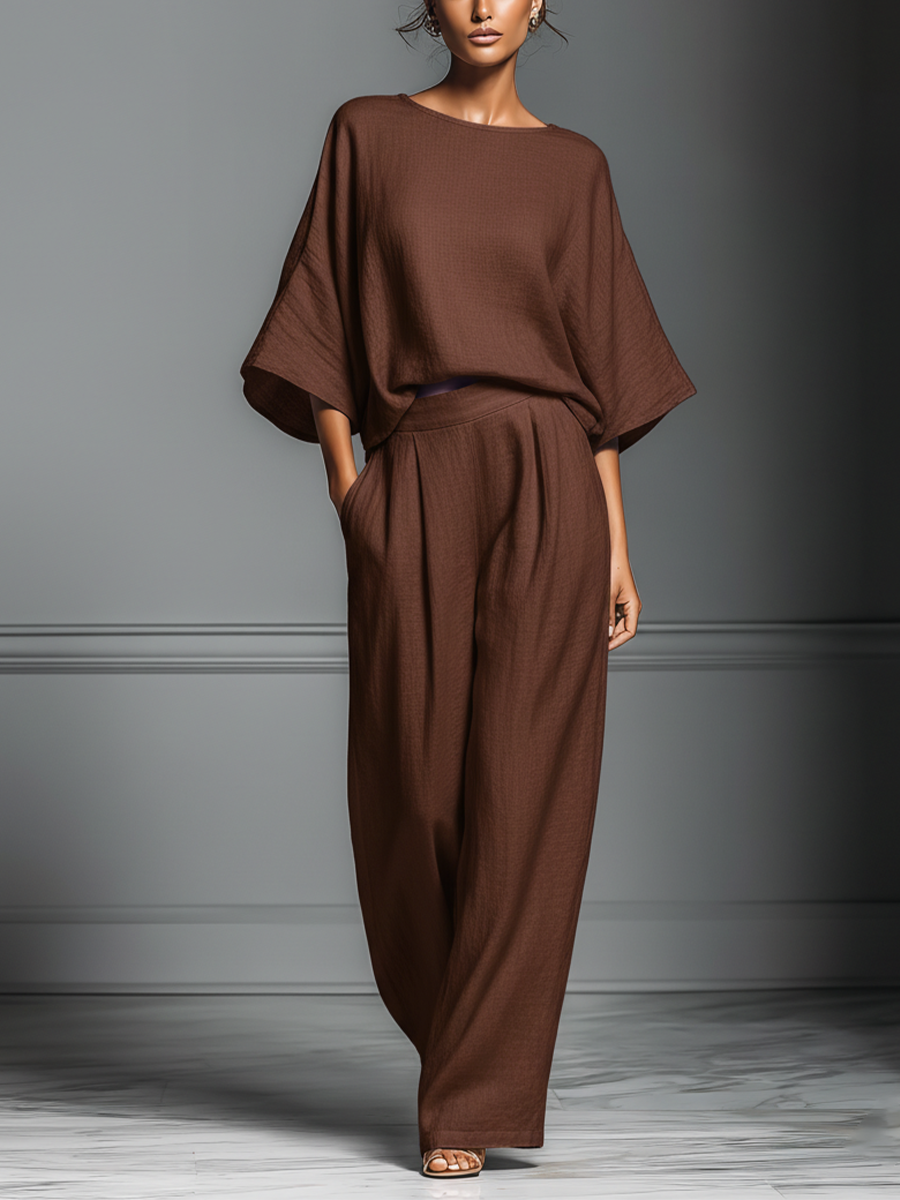 Women's Brown Cotton And Linen Blend Oversized Short-Sleeve Blouse & Wide-Leg Pants Set
