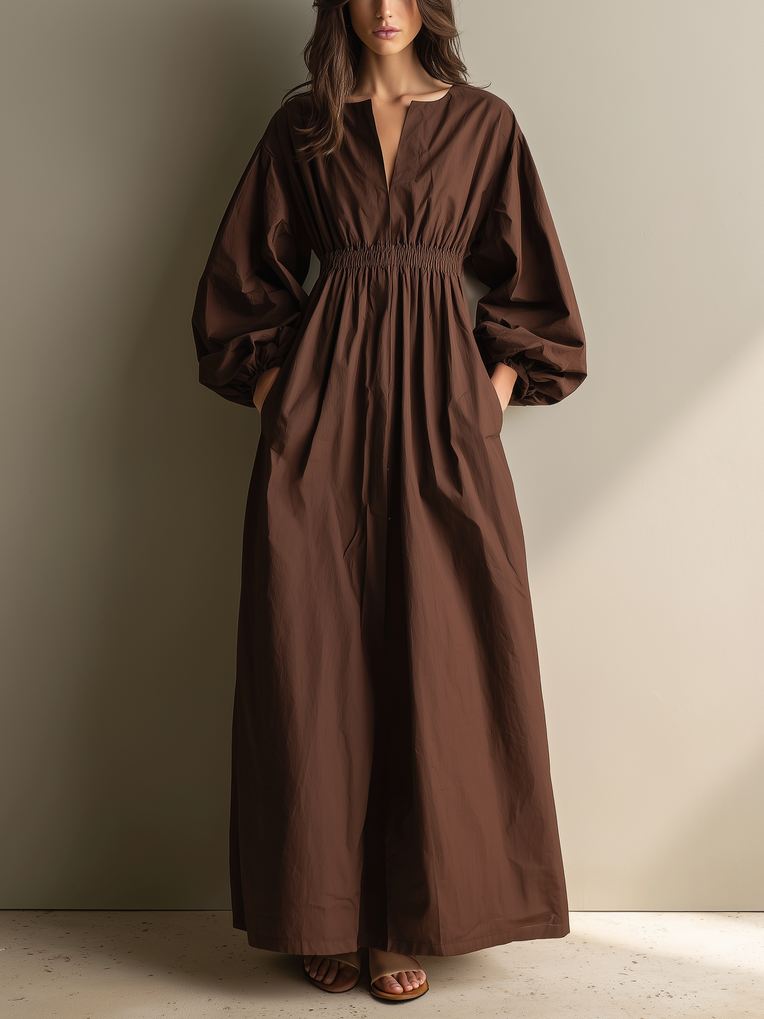 Women's Casual Brown Cotton And Linen V-neck Long-sleeved Maxi Dress With Elastic Waist