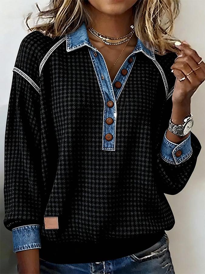 Women's Casual Collared Waffle Patchwork Shirt