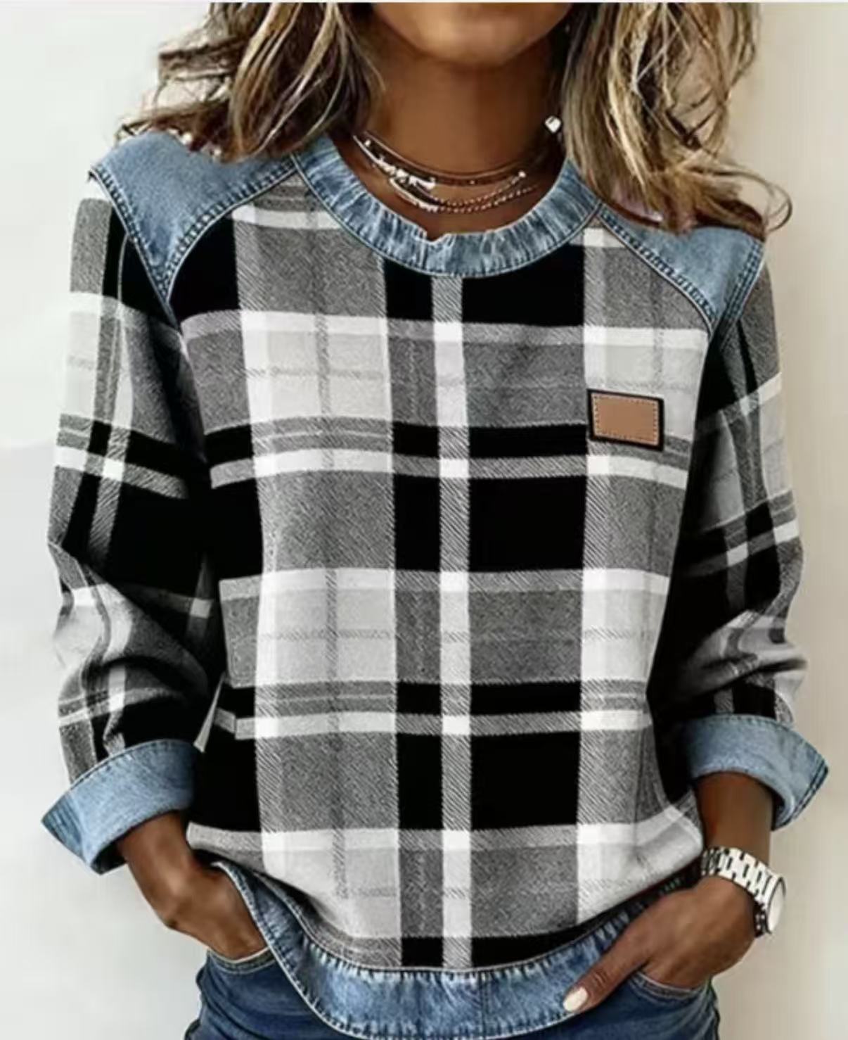 Women's Casual Crewneck Plaid Denim Patchwork Striped Sweatshirt