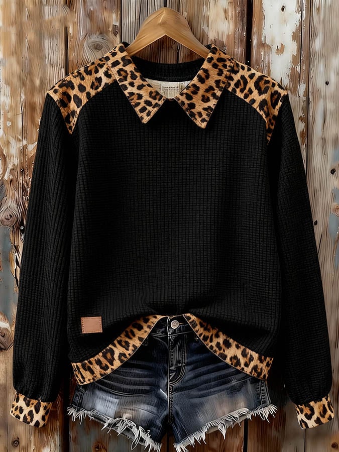 Women'S Casual Lapel Leopard Print Stitching Pullover Sweatshirt
