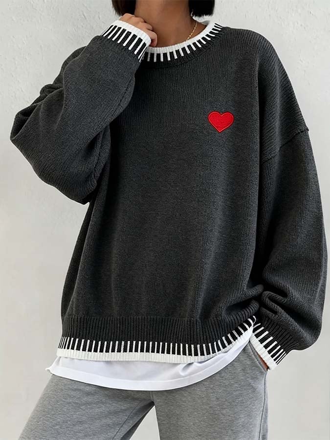 Women'S Casual Loose-Fitting Round-Neck Sweater With A Heart Design