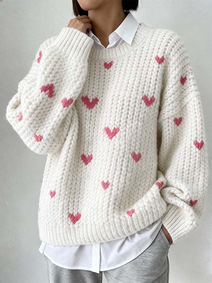 Women'S Casual Loose-Fitting Round-Neck Sweater With A Heart Design