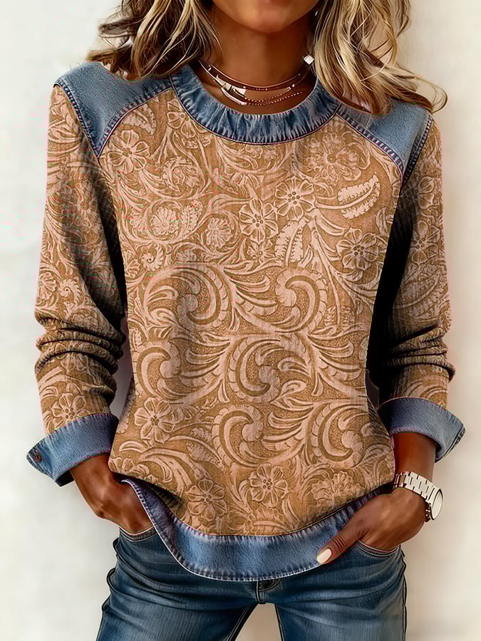 Women's Casual Retro Western Floral Waffle Denim Sweatshirt