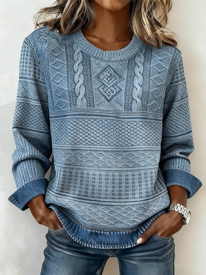 Women's Casual Round Neck Denim Patchwork Print Pullover Top