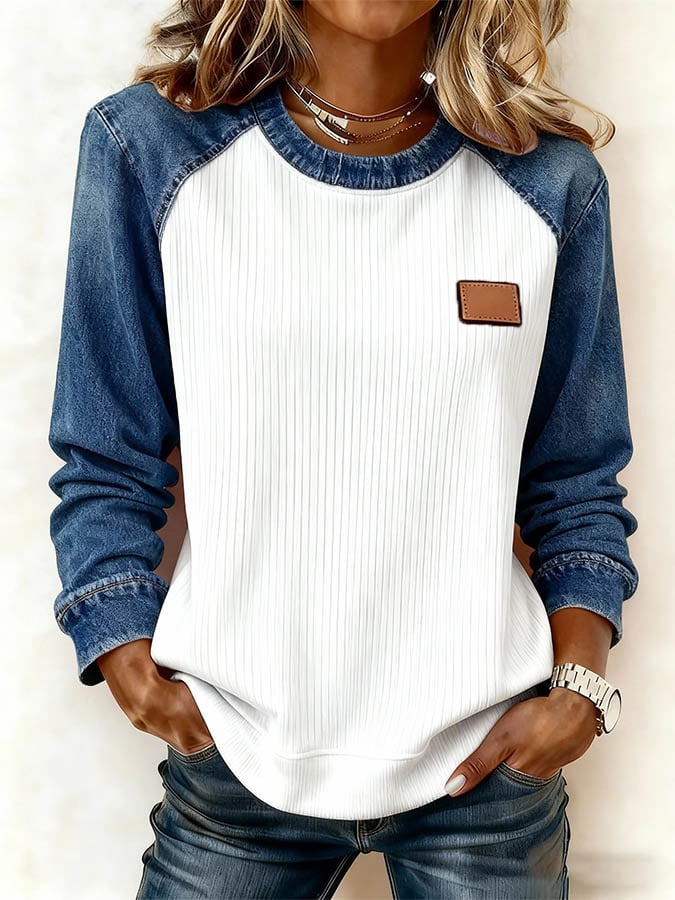 Women'S Casual Round Neck Denim Patchwork Pullover Sweatshirt