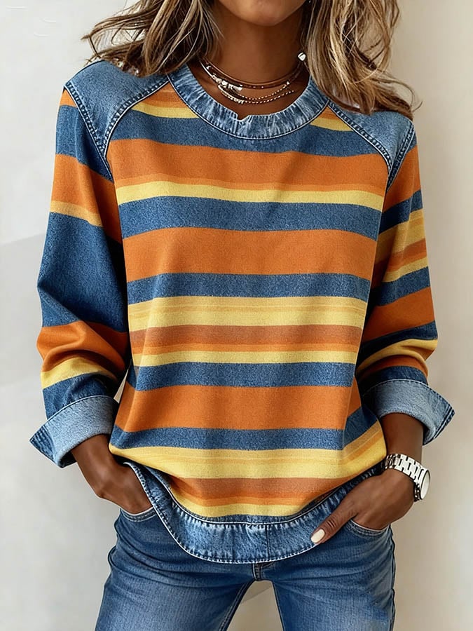 Women'S Casual Round Neck Denim Patchwork Striped Print Pullover Sweatshirt