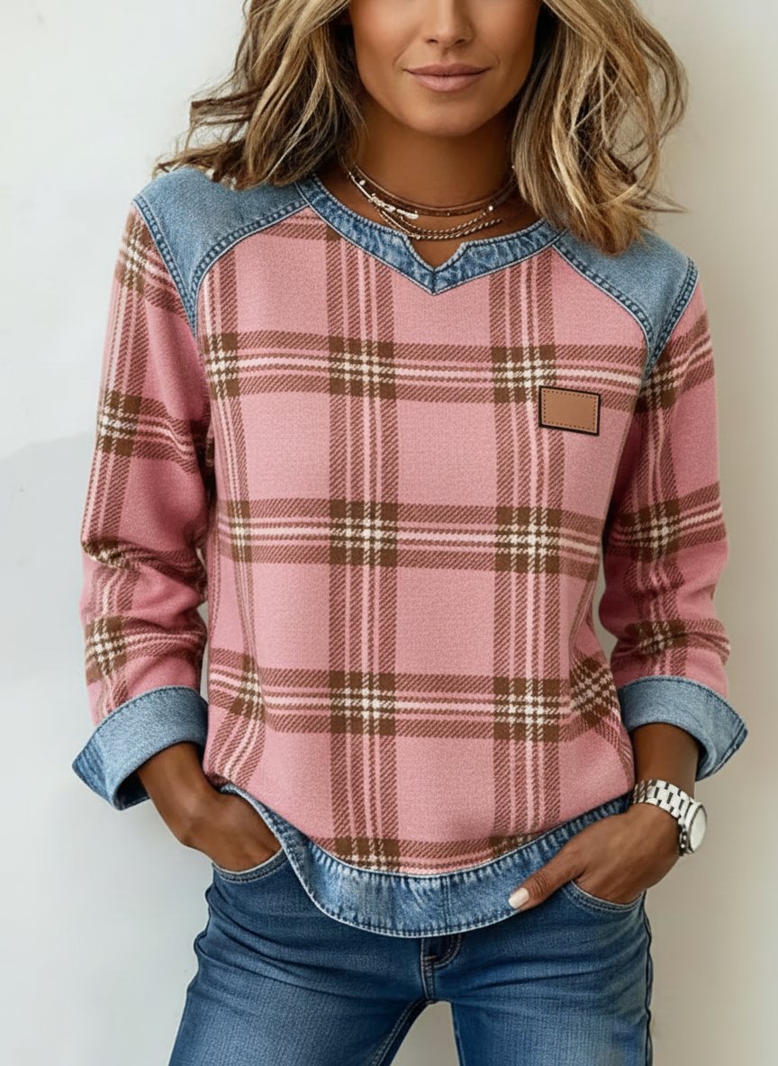 Women'S Casual V Neck Denim Patchwork Plaid Print Pullover Sweatshirt