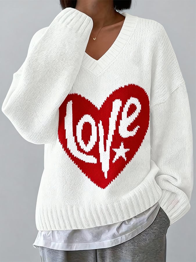 Women'S Casual V-Neck Heart-Patterned Sweater