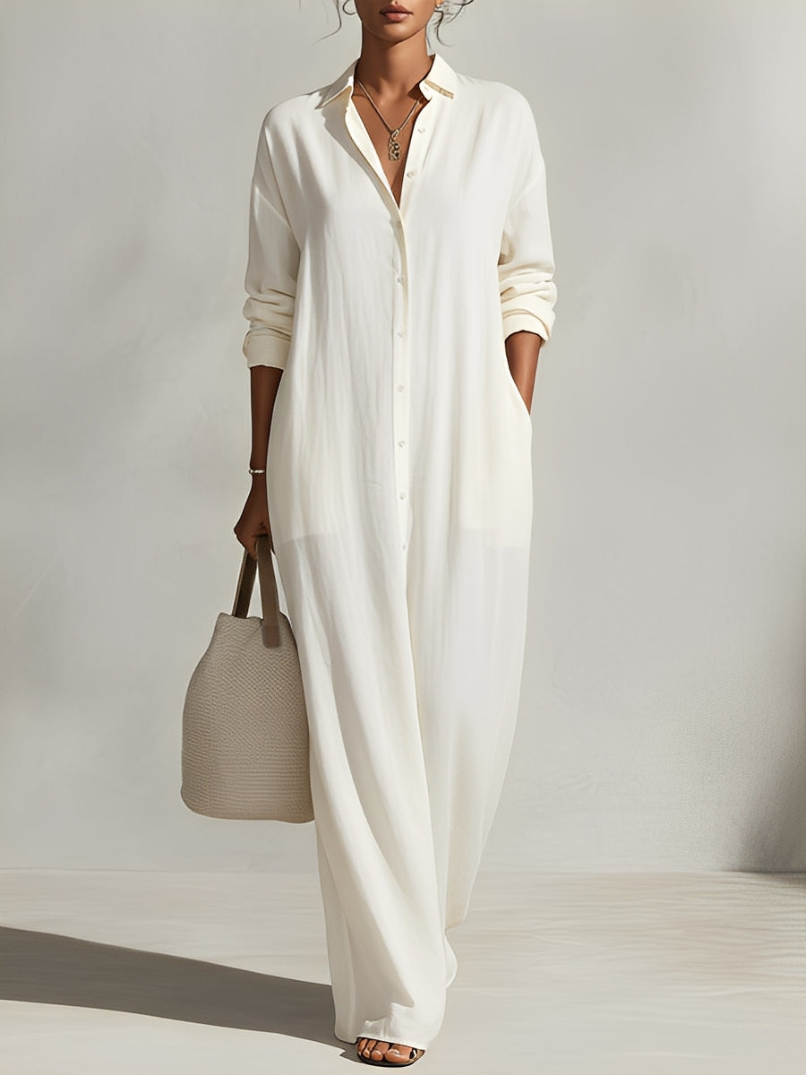 Women's Cream Textured Dress With Button-Front Detail & Relaxed Fit, Modern Casual-Chic Style Maxi Dress