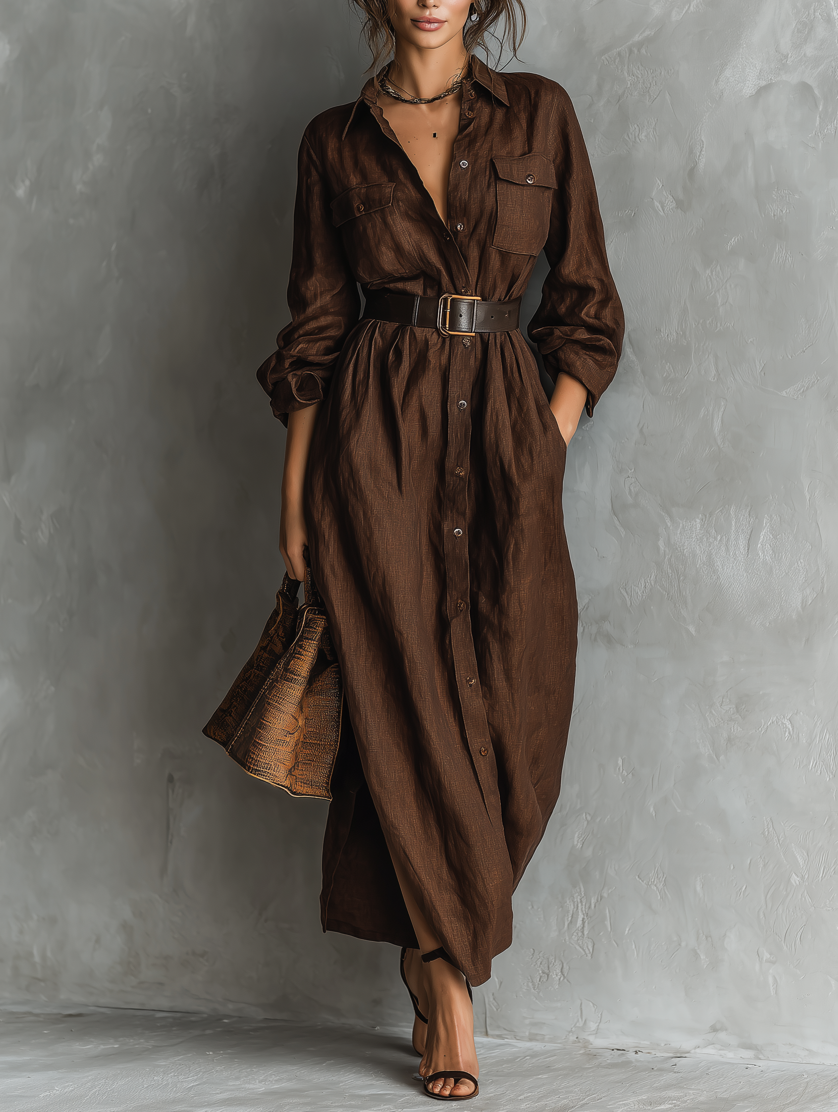 Women's Elegant And Stylish Brown Loose-fitting Long-sleeved Shirt Dress With A Chest Pocket And A Belt At The Waist