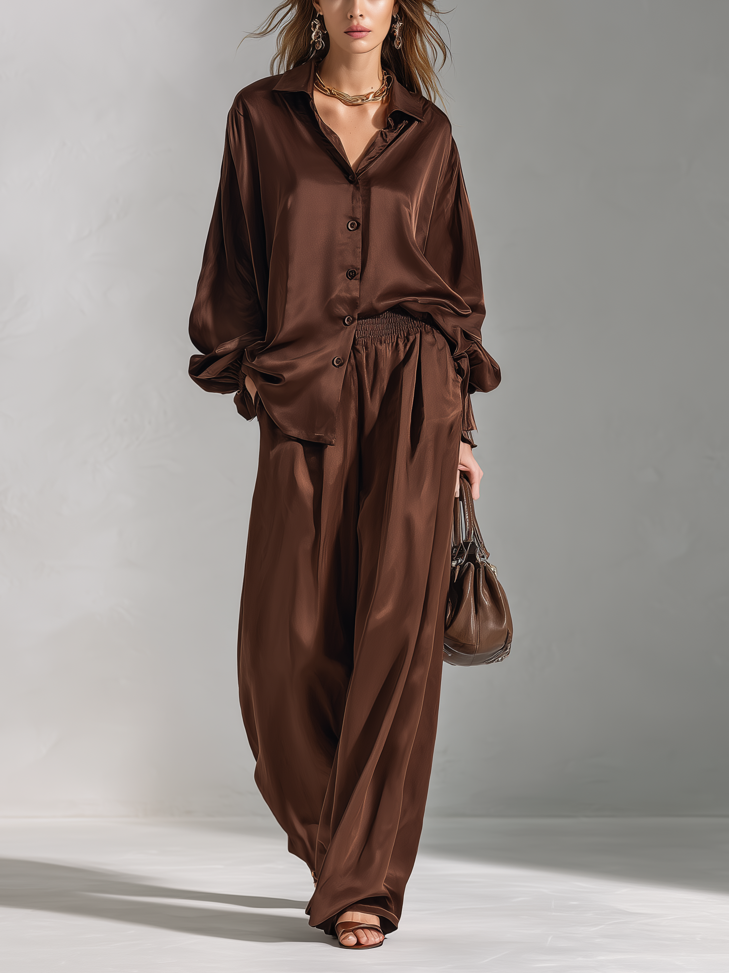 Women's Elegant Brown Satin Long-Sleeve Shirt And Trousers Set