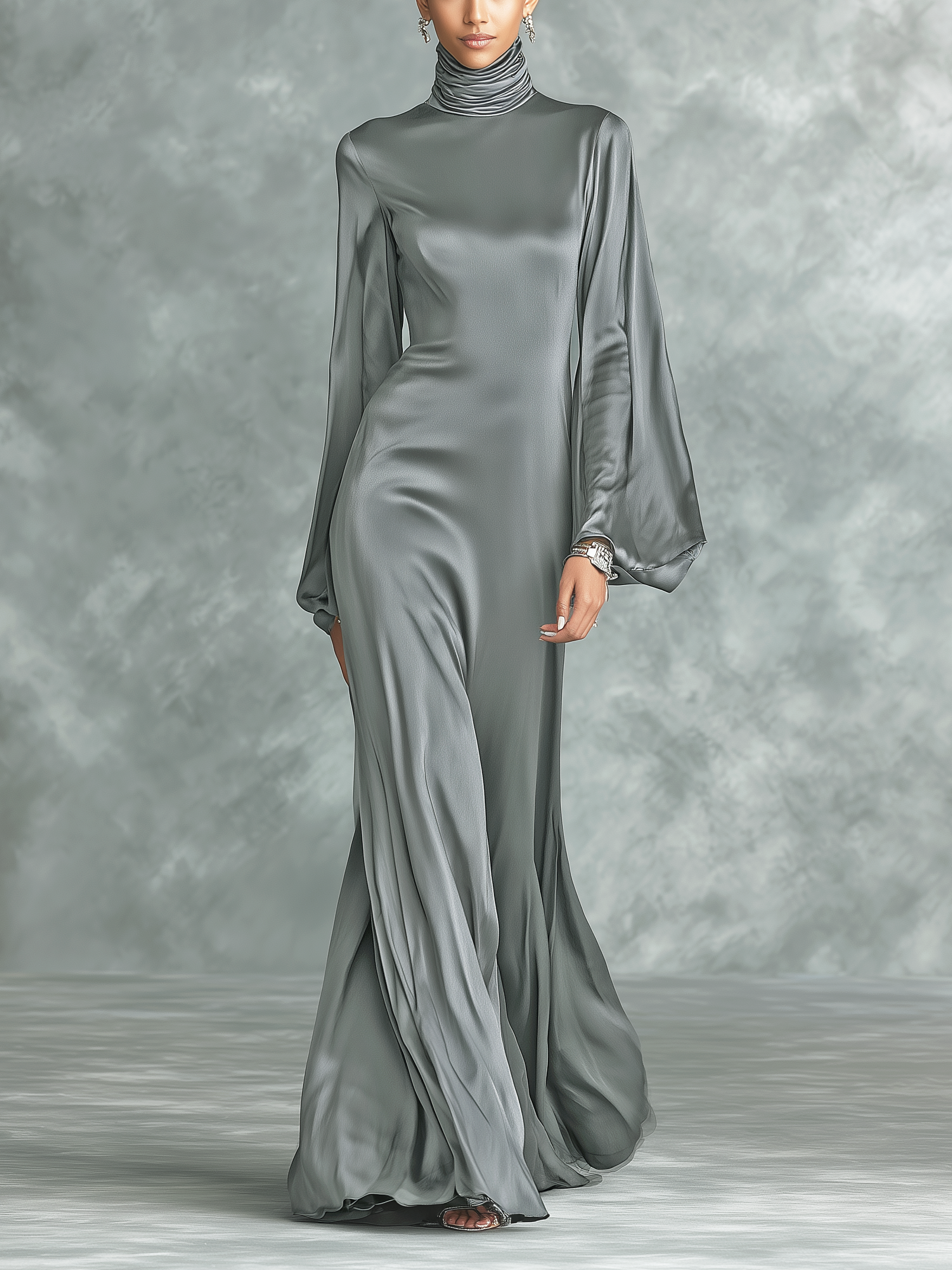 Women's Fashionable Grey Satin High-neck Long-sleeved Loose-fitting Maxi Dress