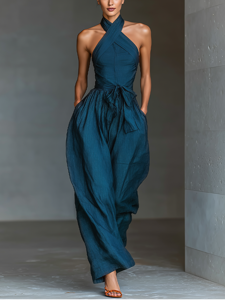 Women's Navy Blue Linen Fabric Cross Halter Wide-Leg Jumpsuit With Tie Waist & Side Pockets