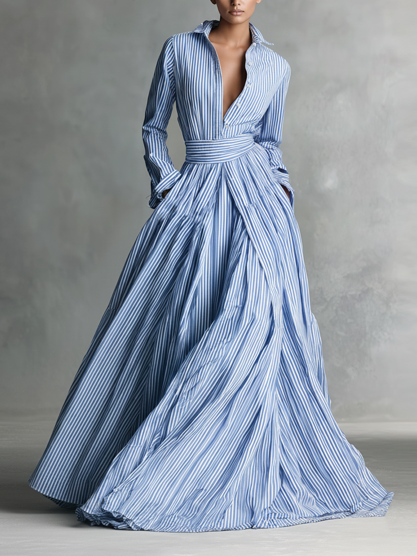 Women's Striped Polyester-cotton Blend Shirt Collar Belt Maxi Dress
