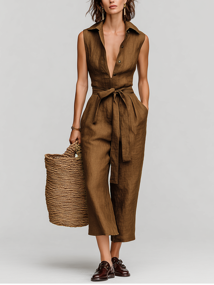 Women's Tobacco Brown Linen Jumpsuit With Self-Tie Waist & Collared V-Neck, Timeless Resort-Casual Style Jumpsuit